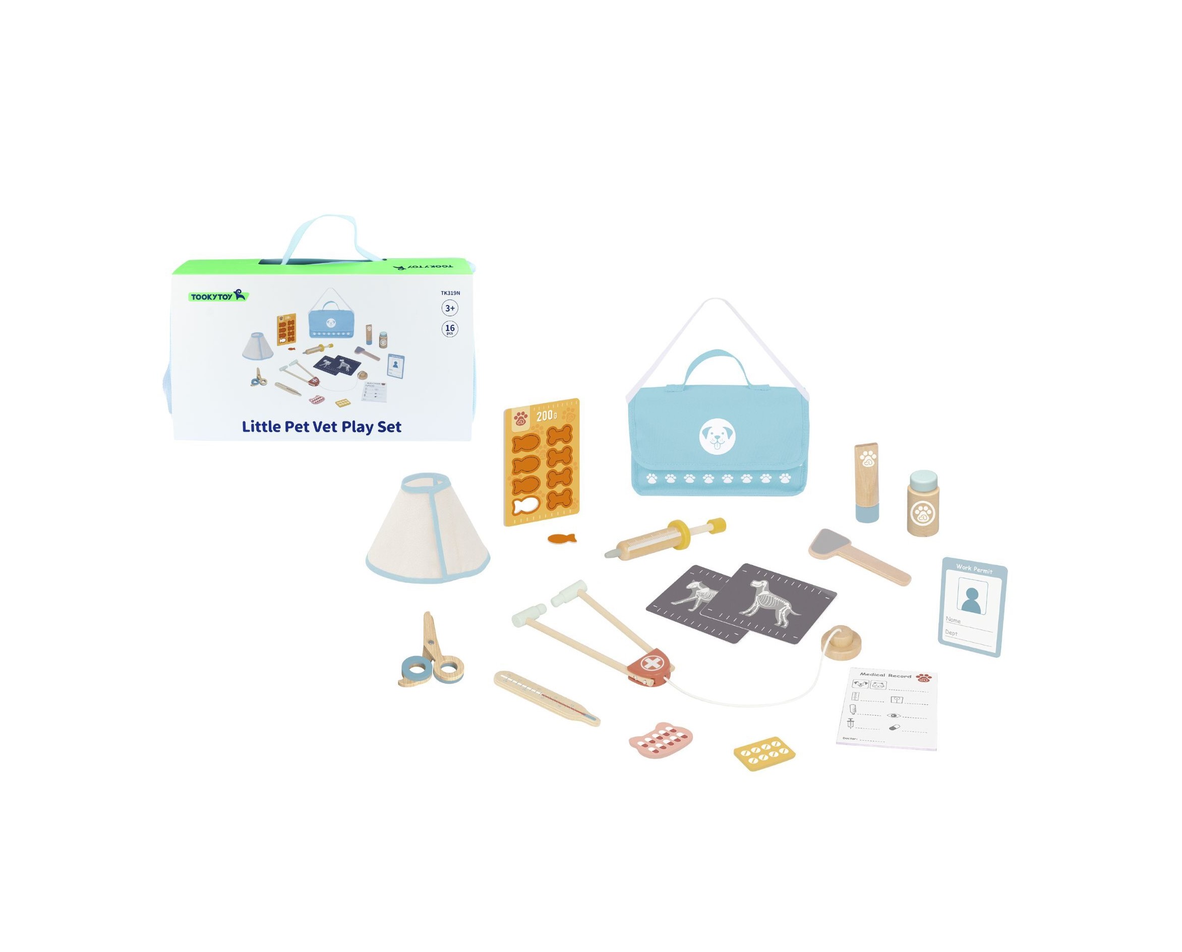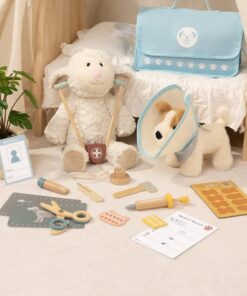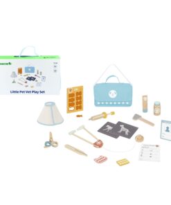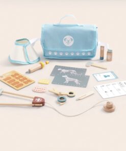 Ένα χαριτωμένο σετ κτηνίατρου για μικρά παιδιά που αγαπούν και λατρεύουν τα ζώα. Το σετ περιλαμβάνει εργαλεία ενός πραγματικού κτηνίατρου, όπως θερμόμετρο, στηθοσκόπιο, κολάρο, σύριγγα, ψαλίδι κ.α. ενθαρρύνοντας τη δημιουργικότητα και την ενσυναίσθηση καθώς τα παιδιά φροντίζουν τους τετράποδους φίλους τους. Όλα τα εργαλεία αποθηκεύονται σε μια υφασμάτινη τσάντα για εύκολη μεταφορά. Το παιχνίδι αυτό ενισχύει τις γνωστικές, κοινωνικές και συναισθηματικές δεξιότητες στα παιδιά, ενώ παράλληλα καλλιεργεί μια βαθιά αγάπη για τα ζώα.