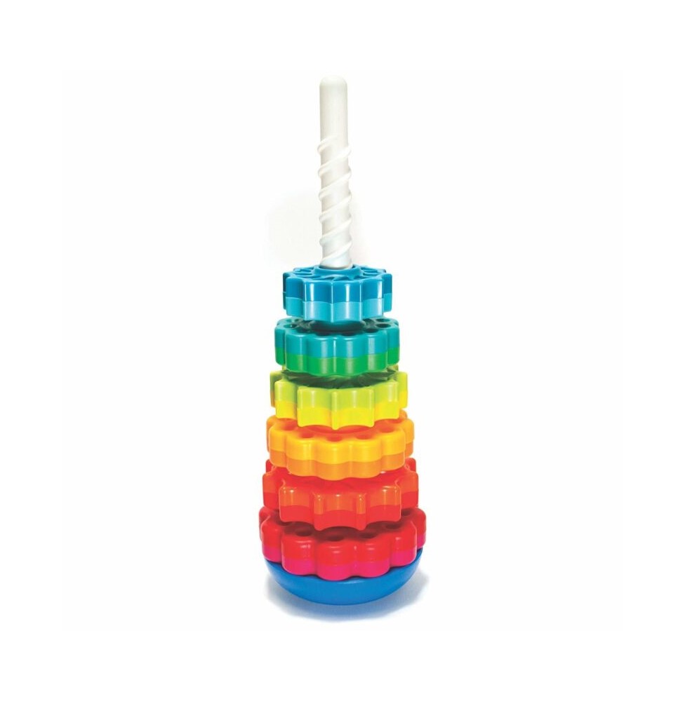 Τα όμορφα, έντονα χρώματα του παιχνιδιού, προσκαλούν το μωρό να εξερευνήσει και να διασκεδάσει. Είναι το πρώτο παιχνίδι στοίβαξης με μια μικρή αλλαγή που θα εκπλήσσει. Το μωρό στοιβάζει τους τροχούς και τους βλέπει να κατεβαίνουν στριφογυριστά στην θέση τους κρατώντας του το ενδιαφέρον. Eίναι έτσι φτιαγμένο ώστε να μπορούν να το κρατήσουν μικρά χεράκια!