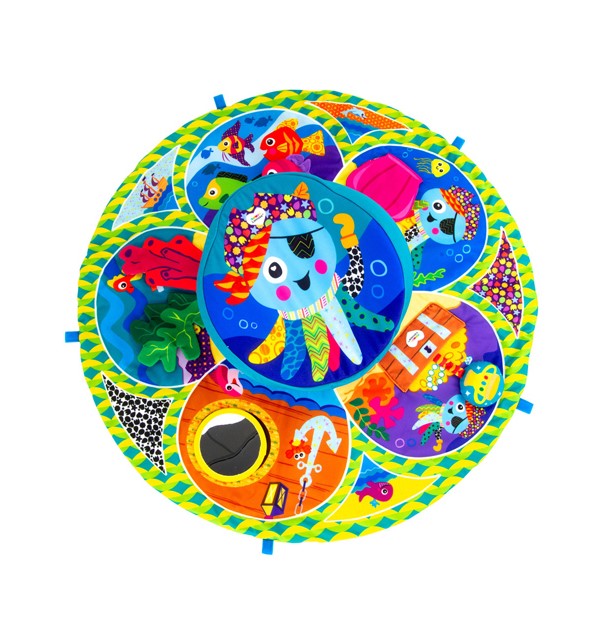 Γυμναστήριο δραστηριοτήτων με περιστρεφόμενο στήριγμα κοιλιάς που κάνει άνετη και αργή περιστροφή. Έχει όμορφα, έντονα χρώματα που προσκαλούν το μωρό να εξερευνήσει και να ανακαλύψει. Η βάση με το μαξιλάρι επιτρέπει στα μωρά να περιστρέφονται στηριζόμενα στην κοιλίτσα τους, αναπτύσσοντας έτσι το πάνω μέρος του σώματός τους. Το χαλάκι διαθέτει 5 διαφορετικά παιχνίδια που το μωρό μπορεί να πιάσει. Τα παιχνίδια αποτελούνται από διαφορετικές υφές και παράγουν ήχους κροταλίσματος και τριξίματος, ενισχύοντας τις ακουστικές αισθήσεις. Υπάρχει, Auch, ένας καθρέφτης που διεγείρει την οπτική αντίληψη. Το χαλάκι μπορεί να παιχτεί ξεχωριστά χωρίς τη βάση περιστροφής.