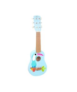 6 strings on the little blue guitar, made of pine for the little music lover to play. It is small in size but made for big things.